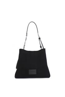 umhängetasche in wildlederoptik mit großem schriftzug auf dem schultergurt black