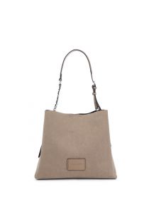 umhängetasche in wildlederoptik mit großem schriftzug auf dem schultergurt taupe