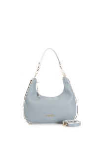 Runde umhängetasche aus genarbtem material mit kette und fädelung. verschluss mit reißverschluss. tasche mit schulterriemen.