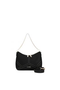 Umhängetasche mit patchwork-verarbeitung und mikronieten-applikationen. in verschiedene fächer unterteilte tasche: eine mit reißverschluss verschlossene trennwand und eine tasche. doppelter schultergurt beide mit kette und aus dem gleichen material wie die tasche.