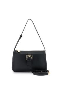 Schultertasche aus Kunstleder mit Vordertasche und verzierter Schnalle. Kontrastierende Rippstrickbündchen und Innenfutter. Verstellbarer und abnehmbarer Schulterriemen.