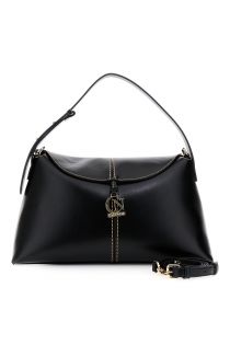 Diese Schultertasche aus Kunstleder mit Überschlag und kontrastierenden Ziernähten sowie einem Metallanhänger mit goldenem Logo verfügt über einen abnehmbaren Schulterriemen für vielseitige Tragemöglichkeiten.