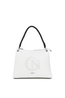 Ungefütterte Beuteltasche mit Casual Look, mit geflochtenen Griffen und einem Logo verziert, das durch dekorative Nähte aus Kunststoff realisiert wurde