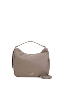 Beuteltasche aus weichem Material und Täschchen an der Vorderseite, Öffnung mit Reißverschluss und CafèNoir in Metallbuchstaben