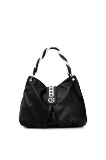 Lebhafte weiche Beuteltasche mit Laschenverschluss, der mit emaillierten, Ton-in-Ton-farbenen Nieten verziert ist. CN-Accessoire und zweifarbiger „Twist“-Griff