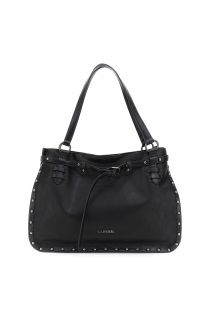 Weiche Einkaufstasche aus verwaschenem, abgenutztem Kunstleder mit Nietenbesatz. Der Riemen ist mit einer Schnalle und einem Schriftzug aus Metall versehen, was ihm eine markante, unverwechselbare Note verleiht.