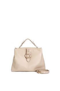 weiche handtasche mit geflochtenem griff, schnalle und abnehmbarem schultergurt. beige