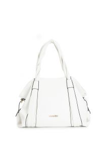 Weicher shopper mit reißverschluss gerollten griffen und dekorativem anhänger in tulpenform.