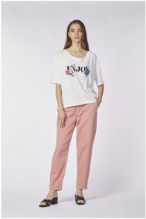 Weites t-shirt aus baumwolljersey mit schlitz hinten und blumenstickerei
