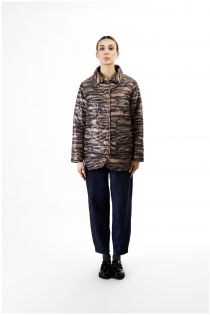 Wende-daunenjacke mit einer unifarbenen seite und einer bedruckten seite. aufgesetzte taschen auf beiden seiten. perfektes kleidungsstück für den saisonangriff.