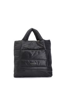Einkaufstasche aus gepolstertem wendbarem nylon mit einer glatten seite und aufgesetzter tasche und einer seite mit „be noir“-schriftzug und gummilogo bedruckt.