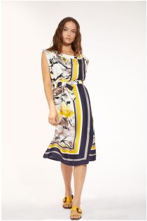 Elegantes Kleid in Wickeloptik aus bedrucktem Viskosesatin mit Streifen und Blumen. Einfarbige Farbkontraste am Rand des Ausschnitts