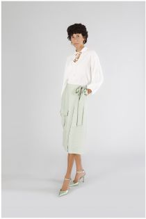 Rock im portemonnaie-stil unterhalb des knies mit maxi-seitentasche aus fließendem fließendem stoff. das seitliche schleifendetail verleiht ihrer garderobe einen hauch von weiblichkeit und verspieltheit. perfektes modell für alle die bei jeder gelegenheit kreativität und originalität zum ausdruck bringen möchten.