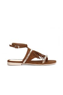 Zehenstegsandalen aus wildleder mit fransen und strasskette. futter und innensohle sind aus leder. der absatz ist 2 cm hoch. angenehm zu tragen und einfach zu kombinieren.