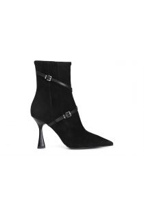 Damenstiefelette aus wildleder in einem eleganten und femininen stil. die schuhe sind mit doppelten lederriemen verziert. schlanker 95 mm diabolo-absatz. weiche innensohle aus leder.