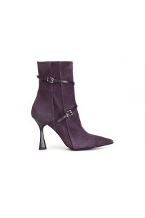 Damenstiefelette aus wildleder in einem eleganten und femininen stil. die schuhe sind mit doppelten lederriemen verziert. schlanker 95 mm diabolo-absatz. weiche innensohle aus leder.