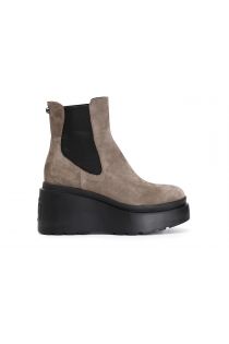 Damenstiefelette aus wildleder mit gummibändern. innensohle aus leder und individuelle keilsohle mit erhabenem logo auf der rückseite.