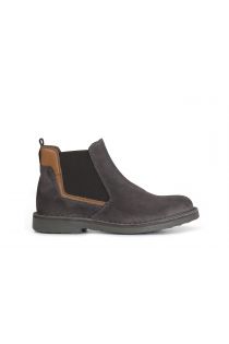 Herrenstiefelette aus wildleder mit seitlichem gummizug und lederbesatz. das obermaterial ist mit der sohle vernäht. innensohle aus leder.