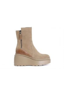 Damenstiefelette aus wildleder mit metallreißverschlüssen und reißverschlüssen. innensohle aus leder und individuelle keilsohle mit erhabenem logo auf der rückseite.