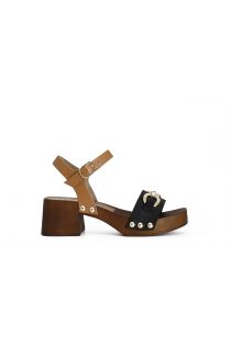 Clogs mit holzabsatz wildleder und horsebit. 24 mm hoher plateauschuh und 55 mm hoher absatz. verstellbares knöchelriemchen mit schnalle.