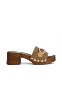 Clogs mit holzabsatz wildleder und horsebit. 24 mm hoher plateauschuh und 55 mm absatz.