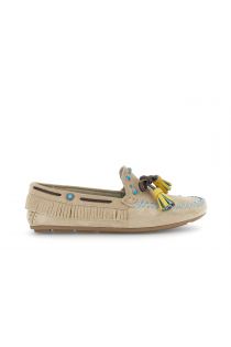 Wildledermokassins mit kontrastierenden ziernähten schleife und bunten quasten. dekorative nieten lederfutter und -innensohle. ein bequemer origineller boho-chic-stil.