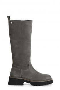 Damenstiefel aus wildleder mit 50-mm-absatz und individuellem zierring. die innensohle ist aus leder gefertigt.