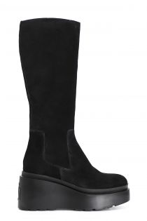 Wildlederstiefel mit plateausohle und absatz. innensohle aus leder und individuelle keilsohle mit erhabenem logo auf der rückseite.