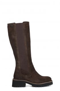 Wildlederstiefel mit elastischen bändern und personalisierter niete. 50 mm hoher absatz. die innensohle ist aus leder.