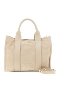 Wildledertasche mit gehämmerten Ledergriffen und -details, einem Metalllogo auf der Vorderseite und einem abnehmbaren Schulterriemen. Eleganz und Funktionalität vereint in einem schicken Alltagsaccessoire.