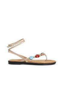 Zehenstegsandalen aus leder mit verzierten steinen und riemen. futter und innensohle sind aus leder. schuh mit leicht abgerundeter form. der absatz beträgt 2.5 cm.