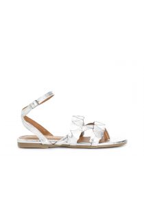 Flache ledersandalen mit doppeltem riemen modell gilda mit knöchelriemchen. zweifarbiges dekor auf der vorderseite das an ein geflecht von blättern erinnert.