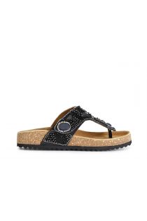 Zehentrenner-modell mit korksohle und verstellbaren riemen verziert mit dégradé-strasssteinen. ein mix aus boho und ethno für einen stilvollen sommer