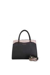 Steife Bauletto-Tasche mit Saffiano-Druck und geschwungenem Detail an der Vorderseite.