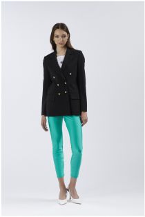 Elegante zweireihige jacke aus stretchstoff. klassisches revers und goldener knopfverschluss. leistentaschen mit patten. perfektes kleidungsstück für ein büro- oder abendoutfit.