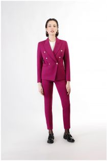 Zweireihige jacke mit spitzem kragen und goldenen knöpfen aus stretchstoff. perfektes kleidungsstück für ein büro-outfit oder für den abend.